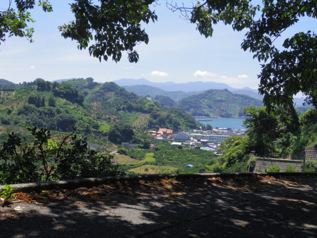 コークボ地区を終えて、農道の木陰で休憩したが、涼しい風が吹いていた。写真を一枚。法華津湾やみかん研究所、我が母校の玉津小学校、遠くには高月山や鬼ヶ城連山が見える。