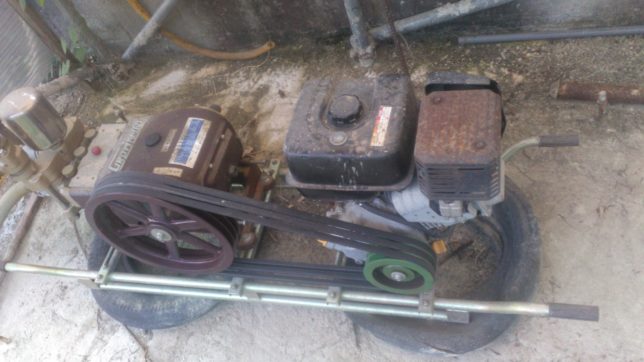 朝からシオカラ地区の甘平園地の灌水を開始。しかしスプリンクラーから水が出ない。調べたら途中の配管が抜けていた。結局午前中いっぱいかかって修理完了。他にもバルブが壊れているのがあり、シオカラ地区は後回しにして、行司が谷の甘平園地から灌水開始。こちらは散水もうまく行った。水源のタンク横のエンジンとポンプがこちら。エンジンは三菱のGB300(10HP)、ポンプはCrown-160で吐出量は毎分120リッターぐらいで使っている。エンジンのガソリンタンクは10リッター、満タンにしてなくなるまで約2時間ほど稼働できる。2時間に吐出する量は15トンぐらい。園地は5アールぐらいなので雨量に換算すると30mmぐらいになる。一回の灌水量としてはまずまず。これだけの灌水をするのに、ガソリン代170円/リッターとすると1700円かかるのだ。農業は大変。