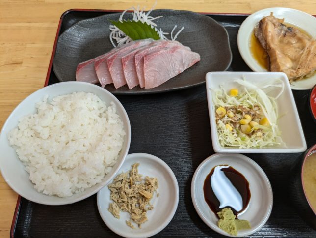 漁港に併設されている市場食堂でお昼だ。今日はカツオは上がっていないとのこと。二人でカンパチ刺身定食を注文。