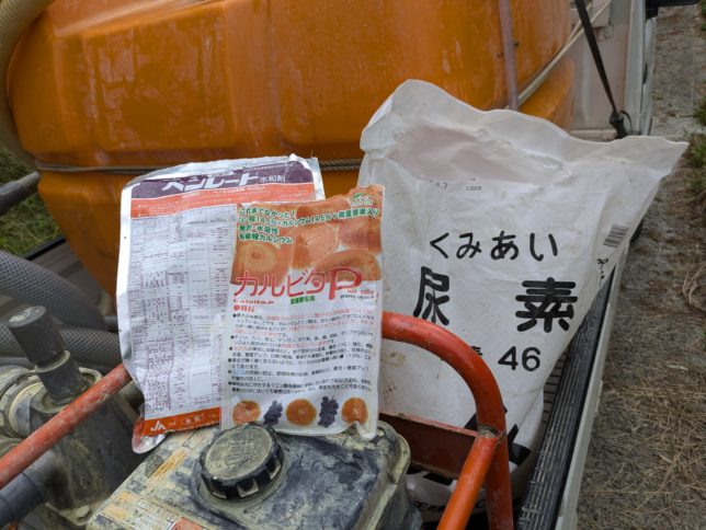 今日は液肥の散布。デコポンと紅まどんなは果皮は弱いとされている。デコポンは秋に雨が多いとデコの部分が水グサれになる現象が出る。紅まどんなも秋の雨で房基にクラッキングが入り商品価値が下がってしまう。紅まどんなはその対策として屋根掛けハウスが推奨されているぐらいだ。オヤジは金がないのでなんとか露地で頑張ろうと思っている。デコポンの水グサれ対策として数年前からロイヤルインダストリーの液肥のカルビタPを2、3回散布しており良好な結果を得ている。いかにも健康な果実になるのを実感していた。2年前ぐらいから紅まどんなにも同じ液肥を散布するようにしている。今のところいい結果なんじゃないかと思っている。というわけで、午前中は和田地区のデコポンに手がけで散布。夕方は影平のデコポンと行司が谷の紅まどんなはスプリンクラーで散布した。今日の農薬はこちら。ベンレートは防腐剤。紅まどんなはもうすぐ袋掛けをするので混ぜておいた。
