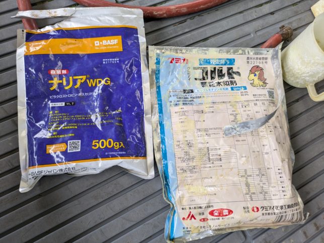 他にもボケ、山椒、スモモなど葉っぱに元気がない。月桂樹もロウムシがべったり張り付いている。そういうわけで消毒することにした。使った農薬は蜜柑に使っているのの余りを使用。うどんこ病などに効く殺菌剤はナリアを、ロウムシなどに効く殺虫剤にコルトを使用。どちらも2000倍。元気づけに尿素500倍も混ぜた。