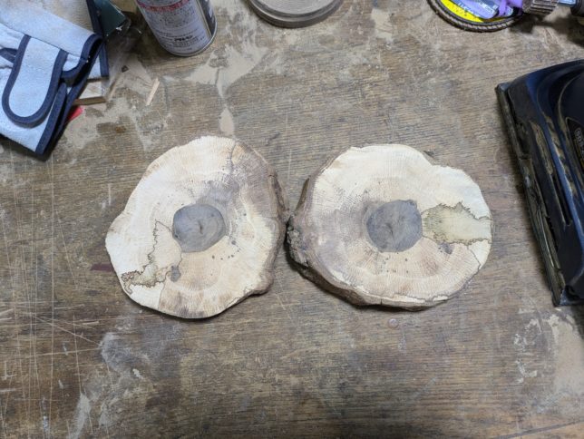 苗木の肥料まきを終わったところで、先日伐採した中庭のウバメガシを使って鍋敷きを作成。切断はチェーンソー、研磨はグラインダーと電動サンダー。