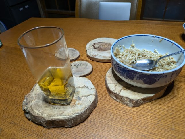 まあ、鍋敷きというよりコースター的な使い方だが、100年生きた木の存在感は半端ない。奥においてあるのは桜で作ったコースターと杉の鍋敷きだがウバメガシの方が断然いいね。暑さは3cm近いんだがこの重量感も必要かな。