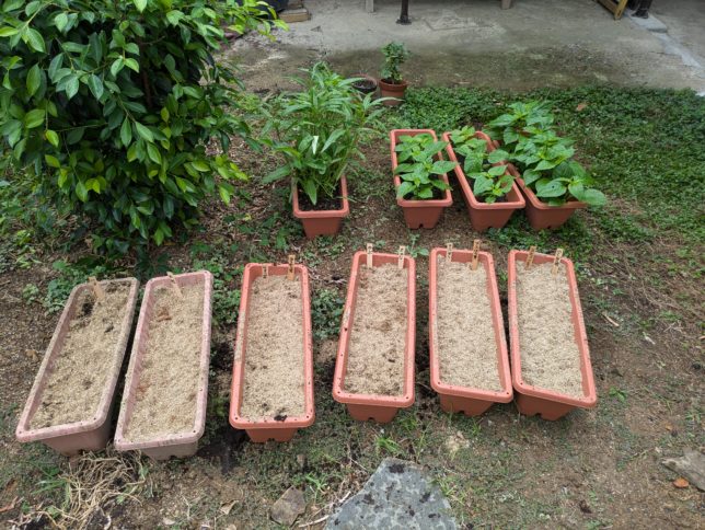 撒いたのはのらぼう菜、アスパラ菜、小松菜、高菜、ほうれん草、牛蒡、大根、カブ、スナップエンドウ、ニラ。うまく育つといいけどね。奥に見えているのは一番左の木はガジュマル、その右は空芯菜。何回も収穫できている。その右側の三鉢は沖縄島とうがらし。順調に育っている。