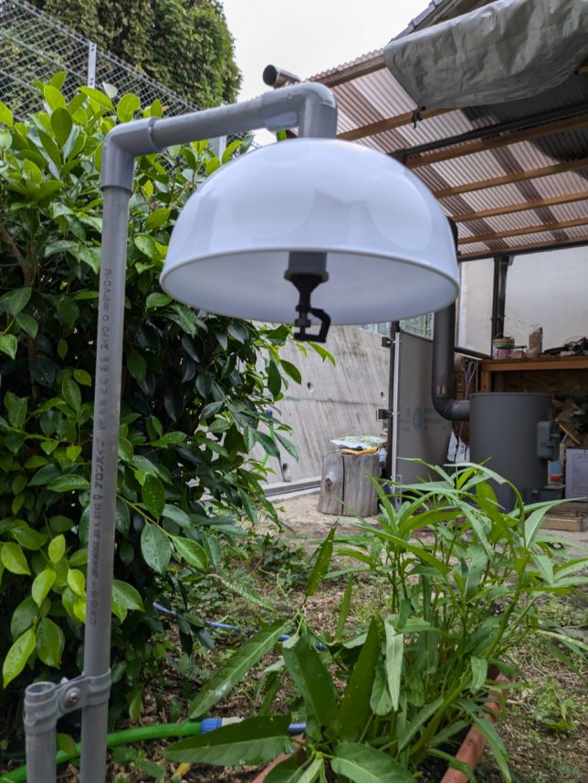 午後はこいつらに水をやるのに工作を。井戸水にタイマーをつけているのでそれを利用して、マイクロスプリンクラーで毎日決まった時間に散水できるようにした。そのままだとちょっと遠くへ飛びすぎなので百均でサラダボウルを買ってきてシェードにした。