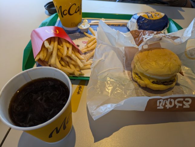 朝起きたら雨だ。朝食の後、もう一寝入り。つまんないので昼前に奥方とお出かけ。昼食は宇和島のマクドナルド。オヤジは芳醇月見バーガー、奥方は普通の月見バーガー。味は満足。年に一回ぐらい食べたい。ポテトは二人で一つで十分。二人ともホットコーヒー。Mサイズが180円。コスパはいい。