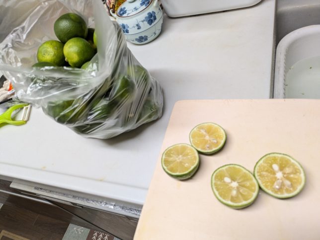 和田地区の大きな甘夏の影に隠れて先代が植えたスダチの木が一本ある。日当たりがいいところだと甘くなるので大きな木の影に植えたんかな。去年は豊作だったが今年は不作。でも玉は大きい。それでもレジ袋いっぱい採れた。