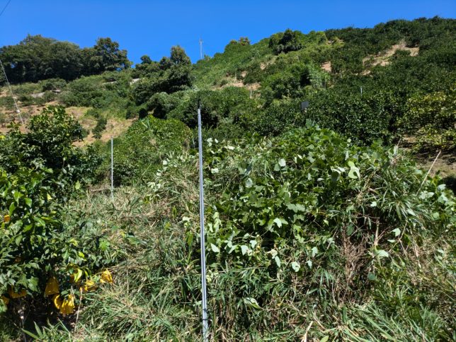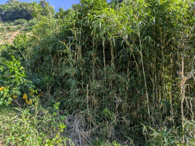 今日もいい天気。秋だね。オヤジは朝から行司が谷の紅まどんな園地の整備。細い竹がのさばってきている。調べたらどうも女竹(めだけ)という種類でササの仲間らしい。片付ける前がこちら。