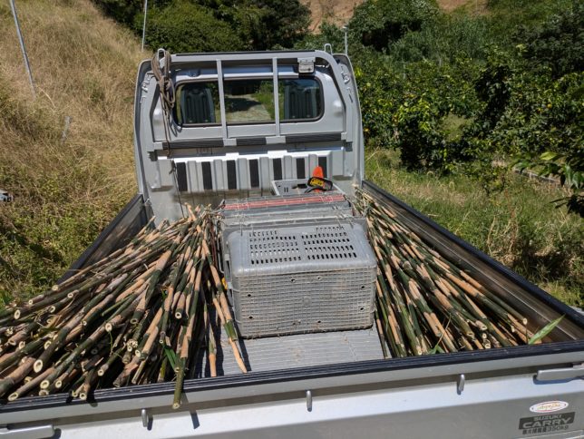 午後は奥方と昨日枯れ木を切ったシオカラ地区の早生園地へ行った。午前中に切った女竹を使って、苗木がうえられる場所に立てていった。夕方までやって100箇所に竹を立てた。100本苗木が植えられるということ。休み明けに苗木を発注しようと思う。