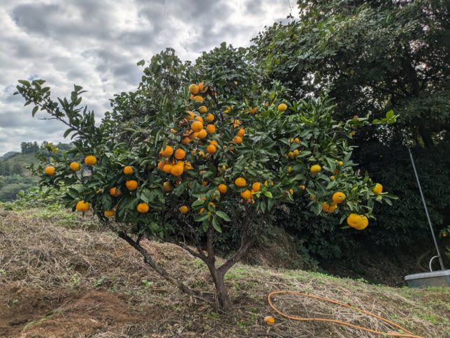 寺のうね園地は去年旱魃でだいぶやられたところ。枯れた木も多いが、実が生っている木もある。だいぶ色がついてきている。