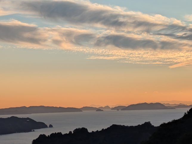 今回の早生の収穫はたとえれば、負けている試合の敗戦処理というところか。とにかく早く終了して良かった。夕方、お酒を買いに宇和のフジへ。帰りの法華津湾がきれいだ。九州の山も見えた。