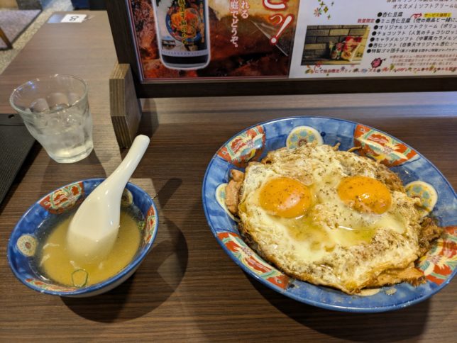ご飯の上にチャーシューの薄切りが乗っていて甘いたれがかかっている。その上に半熟の目玉焼きが二つ。スープもついている。半熟卵をつぶしながらチャーシューとたれがかかったご飯をいただく。奥方の感想は、「タレが甘い」。オヤジも同じ。