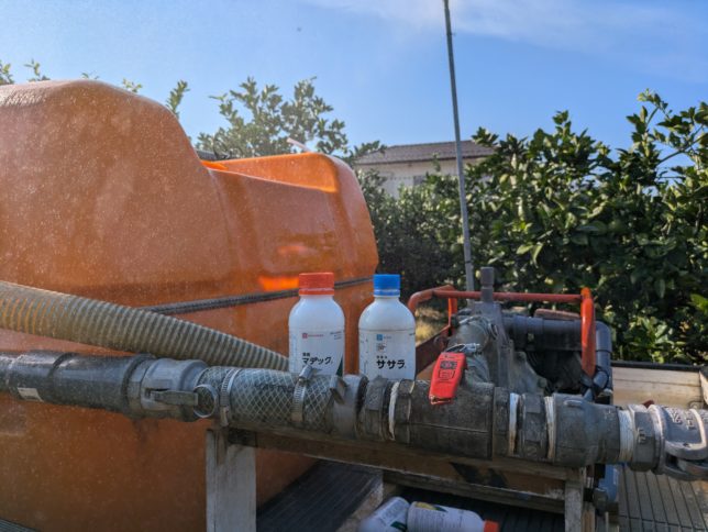 午前中は新田地区の宇和ゴールドのへた落ち防除の2回目。スプリンクラーで散布。農薬はマデックEWの2000倍とササラの2000倍。11時前には終了。宇和ゴールドの出来はまずまず。ちょうど良い生り加減かな。実も大きくなっている。