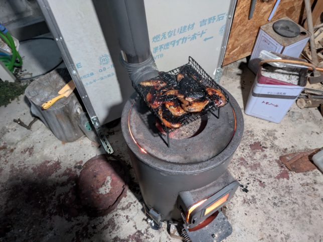 夕方、薪ストーブに火を入れてまずは仕込んでいた鳥手羽を焼いた。今日は失敗。火を入れてすぐの火力の強い時に焼いたのでタレを吸った皮が焦げてしまった。それでも奥方の評価はおいしいとか。