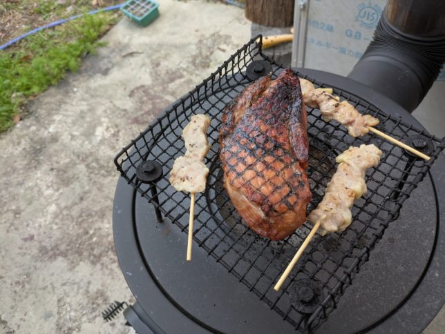 そのあとは薪ストーブでチャーシュー作り。今日は去年の産業祭のときの焼き鳥のあまりを一緒に焼いた。今日もうまくできました。