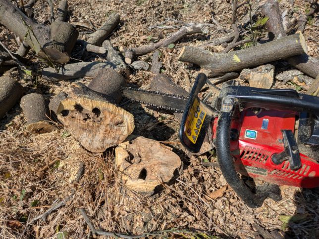 そのあとは和田地区の南柑20号園地の老木の伐採作業。午前中に3本伐採。あと一本残った。伐採した根元の切り口がこちら。