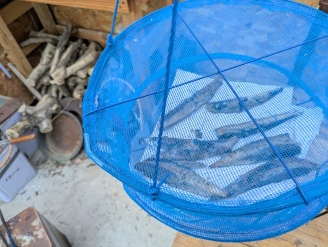 今日食べるの以外を網の中にいれて、カラカラに乾くまで乾燥させることにした。