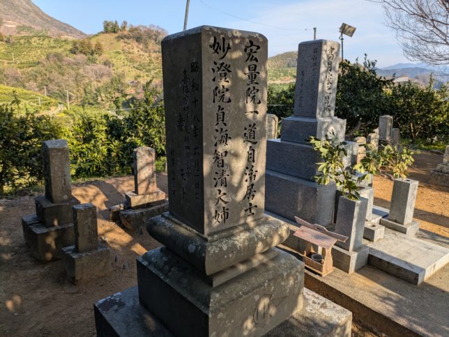 手前は曾祖父さんと曾祖母さんの墓。妙に大きい。その奥が先代が建てた墓。この墓ができるまではみんな土葬だったんだと思う。曾祖母さんは清家吉次郎さんの妹のモトさんだ。