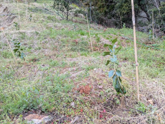 午後はだいぶ天気も持ち直してきたかな。シオカラの早生園地の空いている場所にレモンを植える予定で、まずは穴掘り。1年生の苗なのでスコップを突き刺して少しこじってV字型の植え穴を作っていく。そのあと苗木の根っこをそのV字の穴に差し込んで植え付けは終了。これは現代農業にのっていた記事のやり方。初めてためすが、作業はともかくとても簡単。これでうまくいけば言うことなしだ。ダメな理由もあまり思い浮かばない。25本植えて今日は終了。