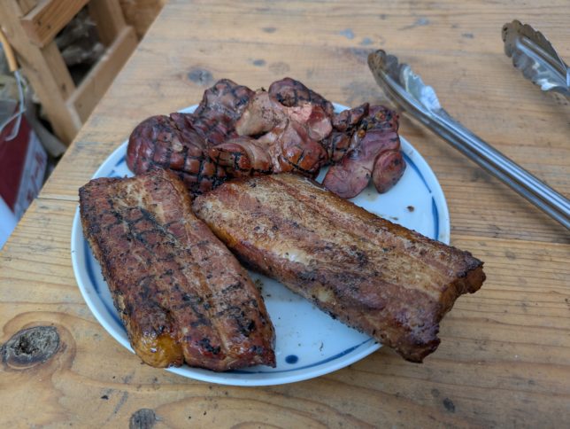 夕方は燻製作業。今日は豚ばらブロックのベーコンと鶏レバーの燻製。味付けはエミフルのCALDIで仕入れたクレイジーソルト。2日前に下処理して冷蔵庫でかんそうさせておいた。これが材料。