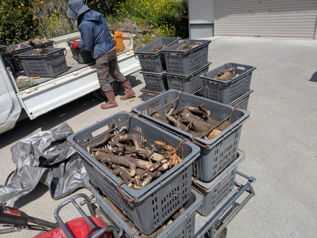 今日もいい天気だ。野外で活動するには最適な季節だ。午前中は和田奥の20号園地の整備を奥方と。だいぶ前に枯れ木を伐採したのだが、切ったあとそのままに放置していたのを二人で片付け作業。切るのは早いが、そのあとの片付けが大変なのだ。30cmぐらいに切っていたのはコンテナに入れて薪や焚き付けとしてとっておく。それ以外の枝は軽トラに積んで我が家の産廃捨て場(道沿いの廃園)に捨てた。薪がいっぱいできた。道の駅などで売っている薪は結構高い。