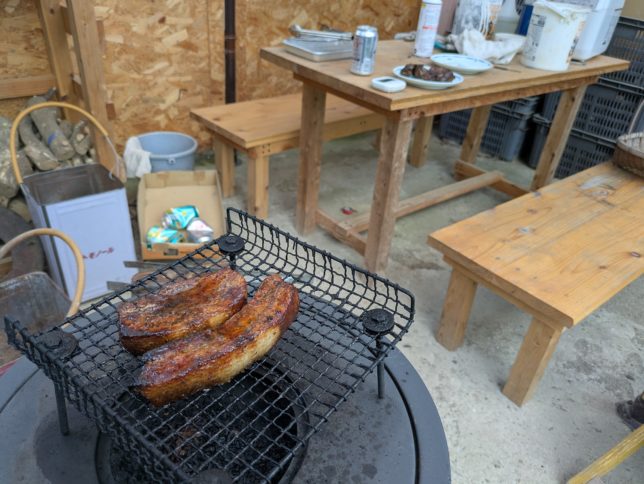 仕事が終わったあとは薪ストーブに火を入れて豚ばらベーコンと鶏レバーの燻製作り。今日もまずまずのでき。