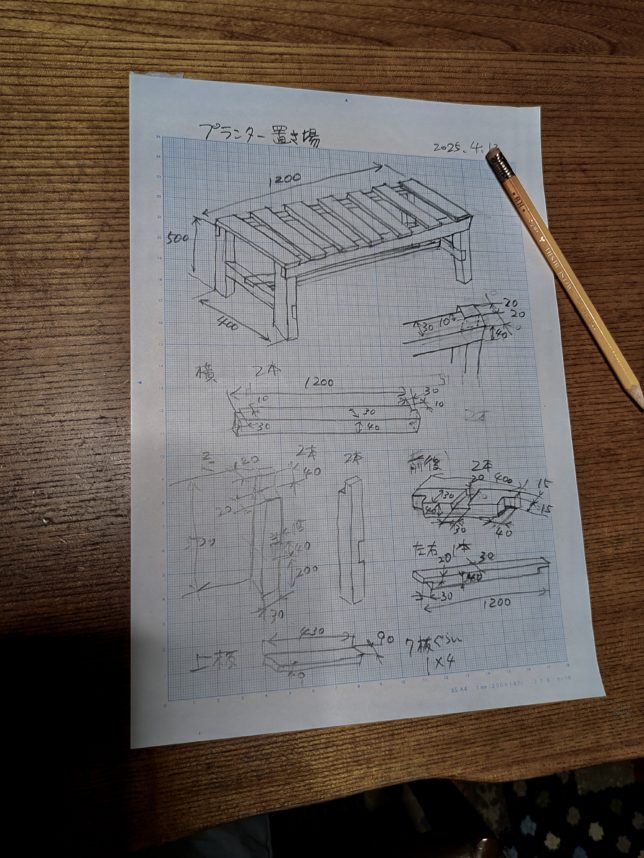 夕方はDIY。今回はプランター置き場。去年はタネをポットで育てようとしたのだが、コンクリの上にじか置きしていて温度が上がりすぎて発芽した苗がやられたようでうまく育たなかった。今回は地面から距離をおいてプランターにタネ撒きをしようと思っている。そのためのプランター置き場だ。水は井戸水をタイマーで毎日散水する。こちらが設計図。今日は材料の切り出しと加工を少し。