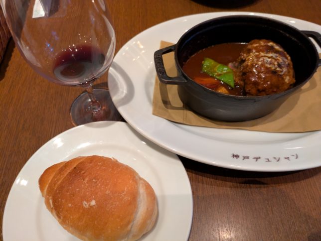 頼んだのはハンバーグと赤ワイン。