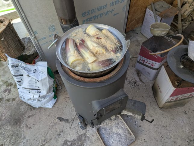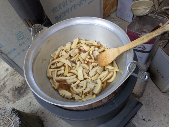 夕方に茹で上がったタケノコを使ってメンマ作り。薪ストーブで調理した。30分ほどぐつぐつ煮て完成。