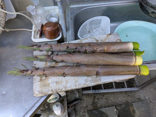 ここは先日タケノコを掘ったとこだが、同じ園地に気の早い破竹が生えてきていた。放っておくと育ってしまうので収穫。奥方がアク抜きしてくれたようだ。