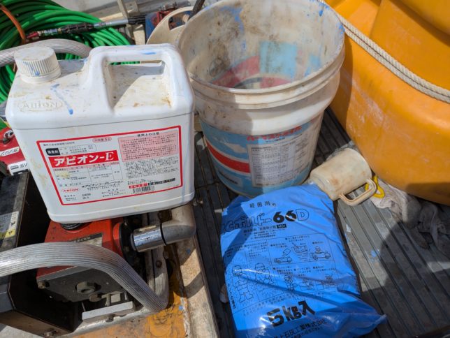 アビオンEはパラフィン系の展着剤で新梢の保護で入れている。午前と午後いっぱいかかってブラッドオレンジ、紅まどんな、レモン、甘夏に散布して終了だ。
