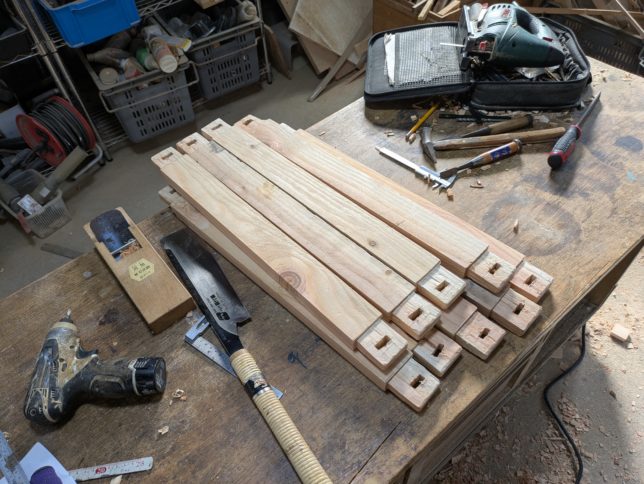 1日かかって9本の梁の作成。けっこう細かい仕事だ。オヤジには苦手な仕事。材料は安い松材を使用。強度はありそう。松脂がちょっと邪魔。ほぞ加工とくさび穴の加工が一応終わったのがこちら。