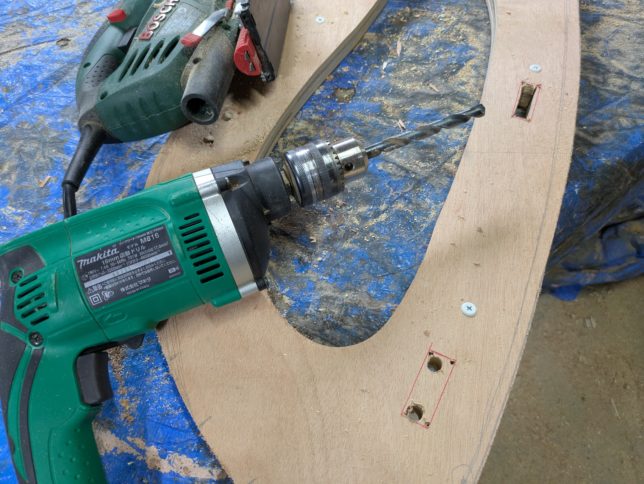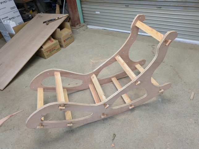 実際に座ってみながら修正作業。ランバーサポート部は腰に強くあたりすぎなので削った。強度は大丈夫のようだ。アームレスやフットレストの位置も決定。座板や背板用に奥に見える合板を細く切ったところで今日は終了。まずまず順調。
