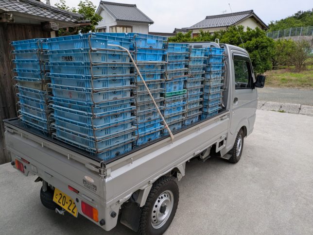 朝一は奥方に手伝ってもらってコンテナの返却作業。最初に借りていたのに加えて、途中で共選から借りたのがあるので全部で300杯近く。全部洗ってある。10時ごろまでかかった。