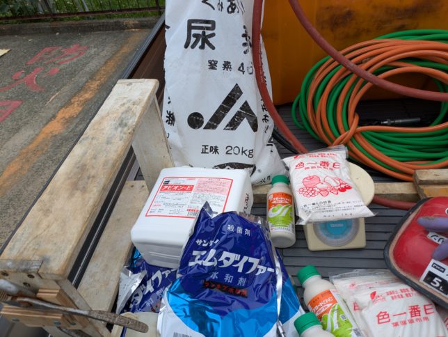 今日の農薬は黒点病対策のエムダイファー(殺菌剤)、殺虫剤のアプロードエース、そのほか展着剤のアビオンE、液肥の色一番と尿素。夕方までやって新田地区の半分ほど終了。