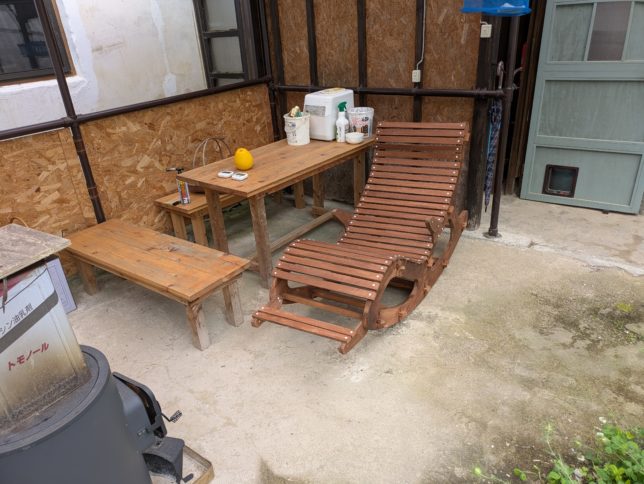 さてロッキングチェアーだが後ろ方向へのローリングがいまいちなのでカンナで削ったりしたのだがあまり改善されない。とりあえず置き場所に移動。