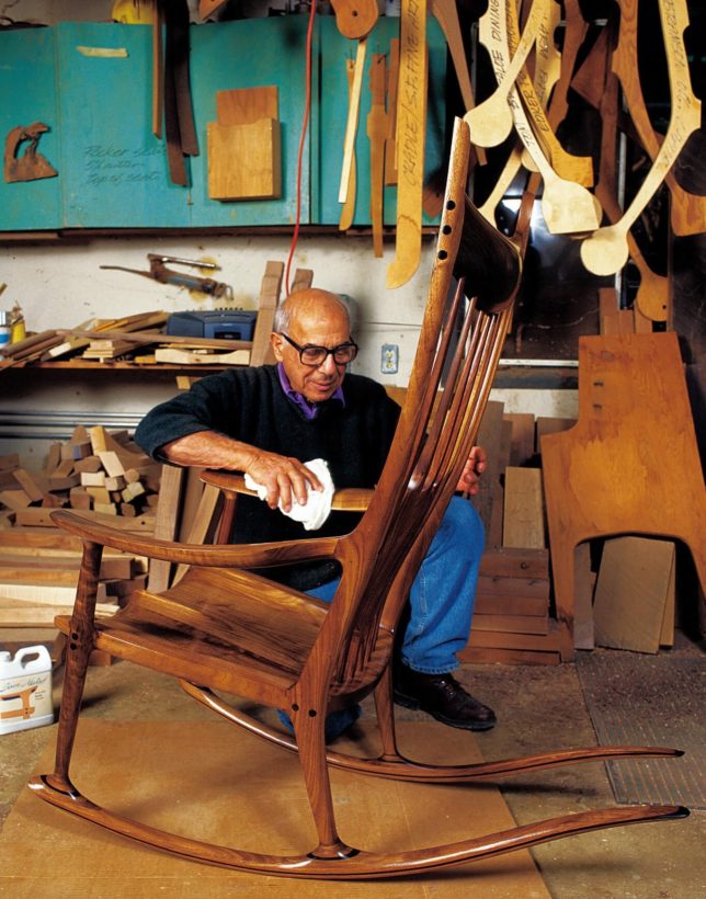 写真はカリフォルニアのサム・ムルーフという方が作っている世界一美しいといわれているロッキングチェアーだ。オヤジの設計では下面の曲げR(半径)は1500mmで一定なのだが、写真を見るとヒップポイントの下から前方の曲げRは大きく、後方の曲げRは小さくしているようだ。さらにその後ろに行くとほぼ水平になりそれ以上傾かないようになっている。後ろに傾こうとした時に、傾き安くて、しかも安全な構造と言える。さらに細いので撓むことで復元力が発生するのかもしれない。一度本物のロッキングチェアーに座ってみなければ。