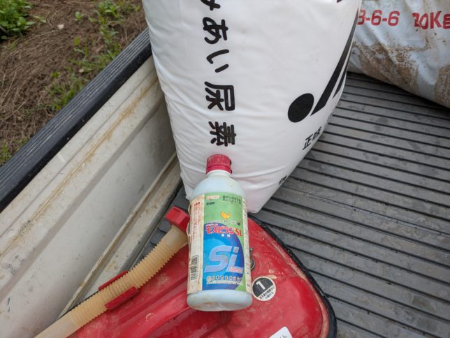 午後はまずは柿の消毒。いっぱい実がついていたのだが、ガンガン落ちてきている。ちょっと遅くなったがヘタ虫対策の殺虫剤を。これをやらないと全部落ちてしまうこともある。そのあとは同じ農薬を使っての苗木の消毒と肥料やりの作業。苗木の消毒はミカンハモグリガ対策でモスピラン(殺虫剤)3000倍。液肥として尿素の1000倍も。そのあと肥料も一掴みづつ根元に撒いた。まずは新田地区から。