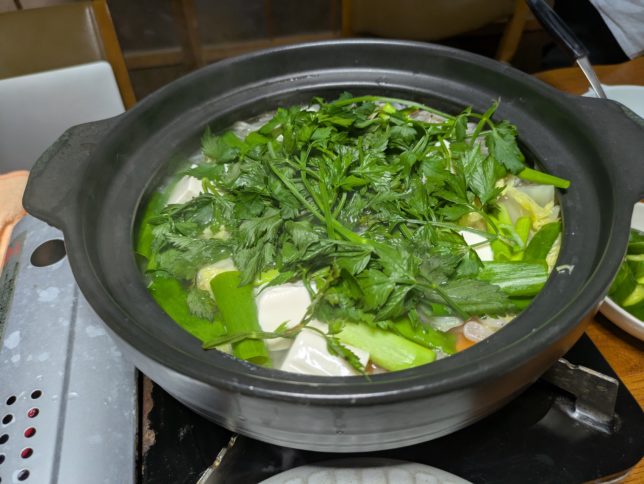 セリは鍋の材料にもいいようなので、奥方に依頼して今日の晩御飯はセリ鍋。エアコンをガンガンに効かせての夏の鍋もいいもんだ。