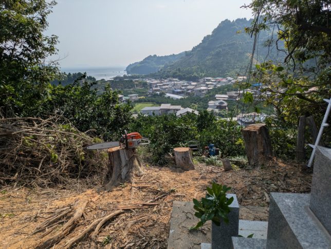 伐採した木は短く切って墓の横に積んでもらった。