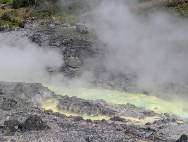そこから1時間ぐらい走ってきょうも目的地の玉川温泉へ。湧出量は日本一らしい。まずは湯に入る。大きな木造の大浴場にいろいろな種類の温泉があった。強酸性で入っていると肌がピリピリする。効能はあるようで、腰痛や神経痛に効いたようだ。風呂に入ったあとみんなで、散歩コースへ。あちこちから湯煙が上がっていて、黄色い硫黄がこびりついている。湯の花も採取していた。