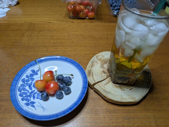 今日のお酒のあては妹からもらった北海道産のサクランボと新潟産のブルーベリー。お酒はナツメ酒の炭酸割り。果実酒を飲みながら、果物をつまむのもありのようだよ。
