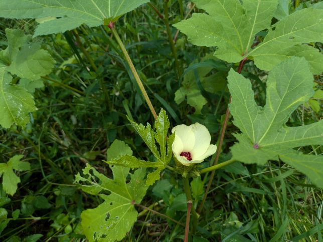雨が降って一安心なのだが、菜園の雑草がとんでもないことになっている。雑草に埋もれていたオクラが花をつけてくれた。枝豆も雑草に埋もれている。なんとかしなきゃね。