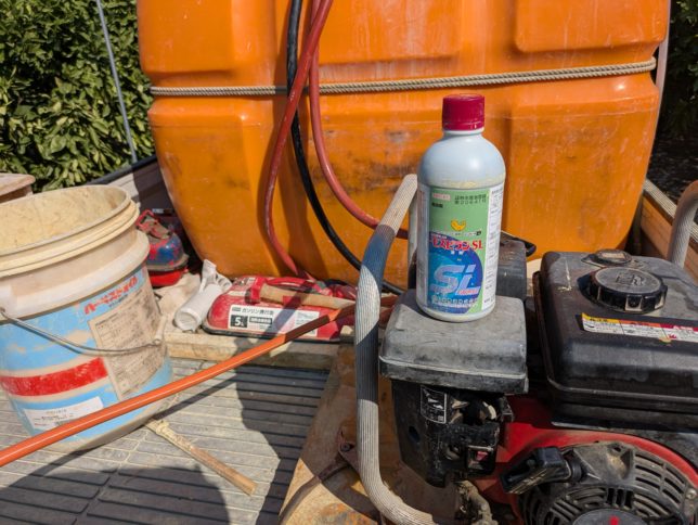 そのあとは天牛(ゴマダラカミキリムシ)の防除を開始。新田地区から。この季節に卵からかえった天牛の幼虫がいる株元に殺虫剤(モスピラン400倍)を使って、動墳からホースで株元に吹き付ける作業