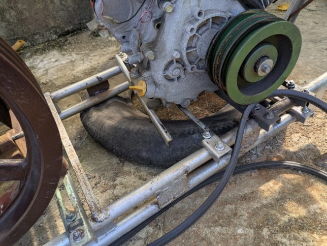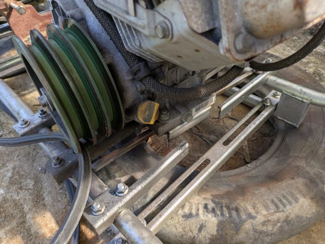 朝寝のあと、灌水の続きをしにポンプ小屋へ。異変が発生していた。エンジンとポンプをつなぐベルトが外れて、エンジンを止めているステーが破損。エンジンが斜めに向いていた。ステーが疲労で破損したようだ。