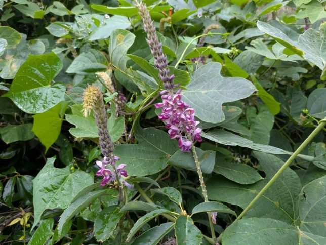 園地のまわりには葛がはびこっている。すごい勢いで伸びている。廃園にするとまずはみかんの木が葛に覆われて、園地が葛の海状態になる。みかん農家にとっては強敵だが、今日は花が咲いていた。花が咲けばそろそろ葛の成長も終わり。冬になればいつのまにかいなくなっている。こちらが葛の花。毎年紹介してるかも。