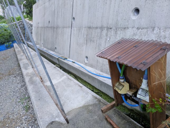 そのあとは和田地区に10本ほどある甘平の灌水の準備。ここは家のすぐ裏。家の井戸水をホースで送って灌水チューブをつかって灌水している。プランター置き場の近くのタイマー置き場からホースを伸ばしている。