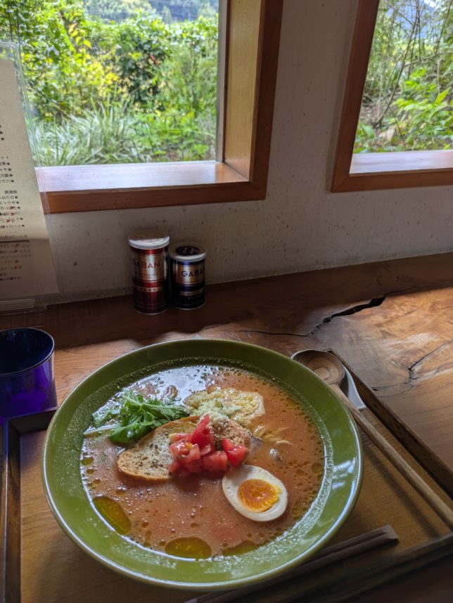 10時ごろから奥方とドライブへ。行き先は宿毛のラーメン屋、二宮金次郎。今年の三月一日に訪れてまた行きたいと思っていた。ルートは門脇旦那に教えてもらった県道4号線。津島町の街中から篠山方面を通って宿毛市に抜ける道だ。ほとんど平坦。途中高知県に入ったあたりで3、4km狭いところがあるが概ね快適な道路だ。車も少ない。宿毛の市街に入る前に目的のラーメン屋が道の右側にある。着いたのは11時45分くらいだったが、なんとか店に潜り込めた。昼ごろになるとお客さんが増えて表の待合所で待つことになったようだ。前回は二人とも頼んだのは旨辛味噌ラーメンだったが、今回はオヤジはトマトとチーズの味噌ラーメン。奥方は果物たっぷり冷麺。オヤジのはジャガイモ、にんじん、玉ねぎのポタージュと魚介の出汁のスープ。チーズとバケットも乗っている。おいしいチャーシューも沈んでいる。かなり攻めた一品。