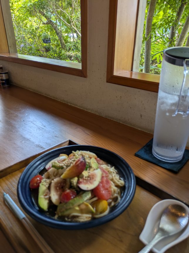 奥方のはフルーツと野菜の冷やし中華。フルーツはいちじく、アボカド、グレープフルーツがたっぷり。
