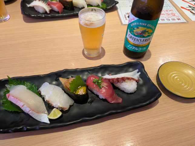 ここのネタはいいね。回転寿司は日本人にとって極上の文化かもと思った。夫婦ともに満足。ところでついノンアルコールビールを頼んだのだが、この麒麟のGreen’sFreeはおいしい。いままでのんだノンアルビールのなかで一番かも。
